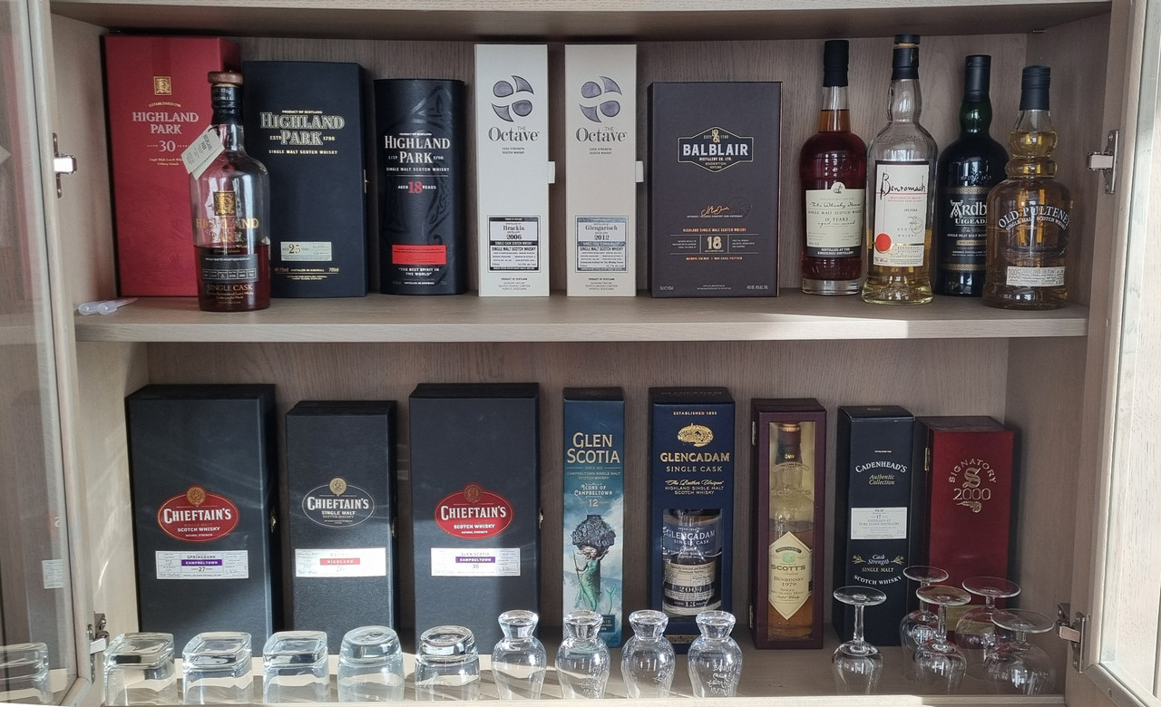 Ik ben lid van een whisky club, en omdat die geleid wordt door een importeur die gespecialiseerd is in Schotse cask strength single malts, is het vooral dat wat er in mijn kast te vinden is.